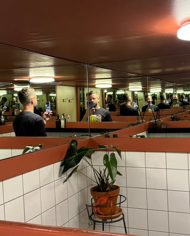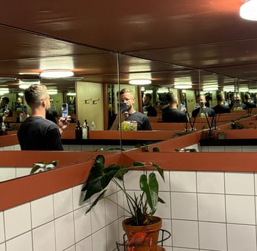We loved sitting at the window bar seats, which are great for people-watching while enjoying the ocean breeze. Easygoing, casual, and ideal for daytime drinks that turn into a longer stay. The queue to the toilet might be long… mirrors like these come with responsibilities-don’t forget your phone! 📸✨