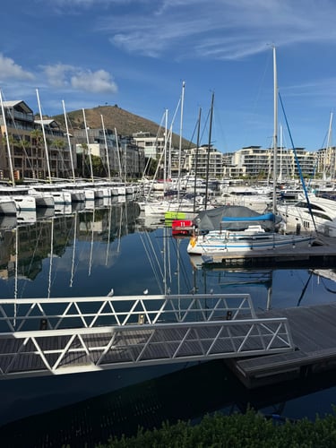 The V&A Waterfront serves as a central hub for shopping, dining, and harbor views, with Table Mountain in the background. It combines retail, entertainment, and maritime atmosphere in one walkable area.